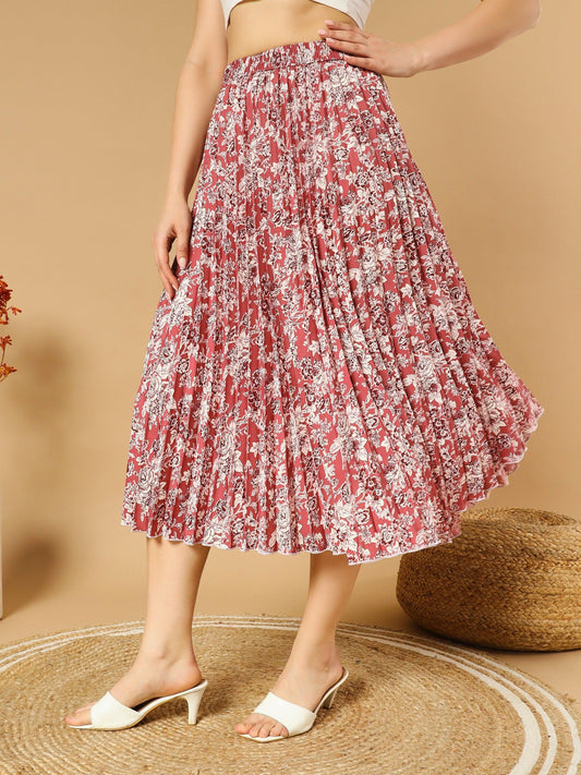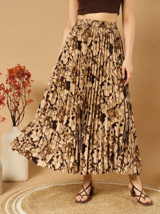 Vintage-inspired Pleated Midi Skirts with Brushstroke Print and Elastic Waistband