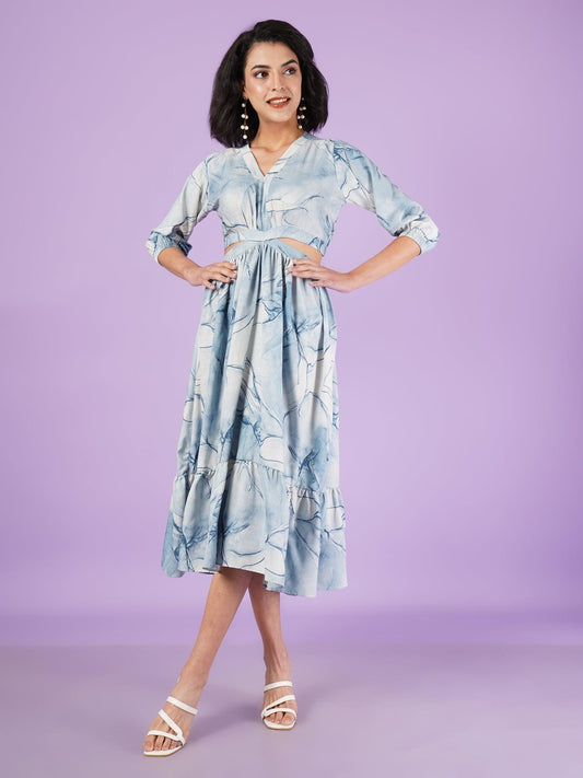 Experience the beauty of our Bluish Flowers Match with Peach V-Neck Midi Dress, featuring a stunning floral print and elegant V-neck design.